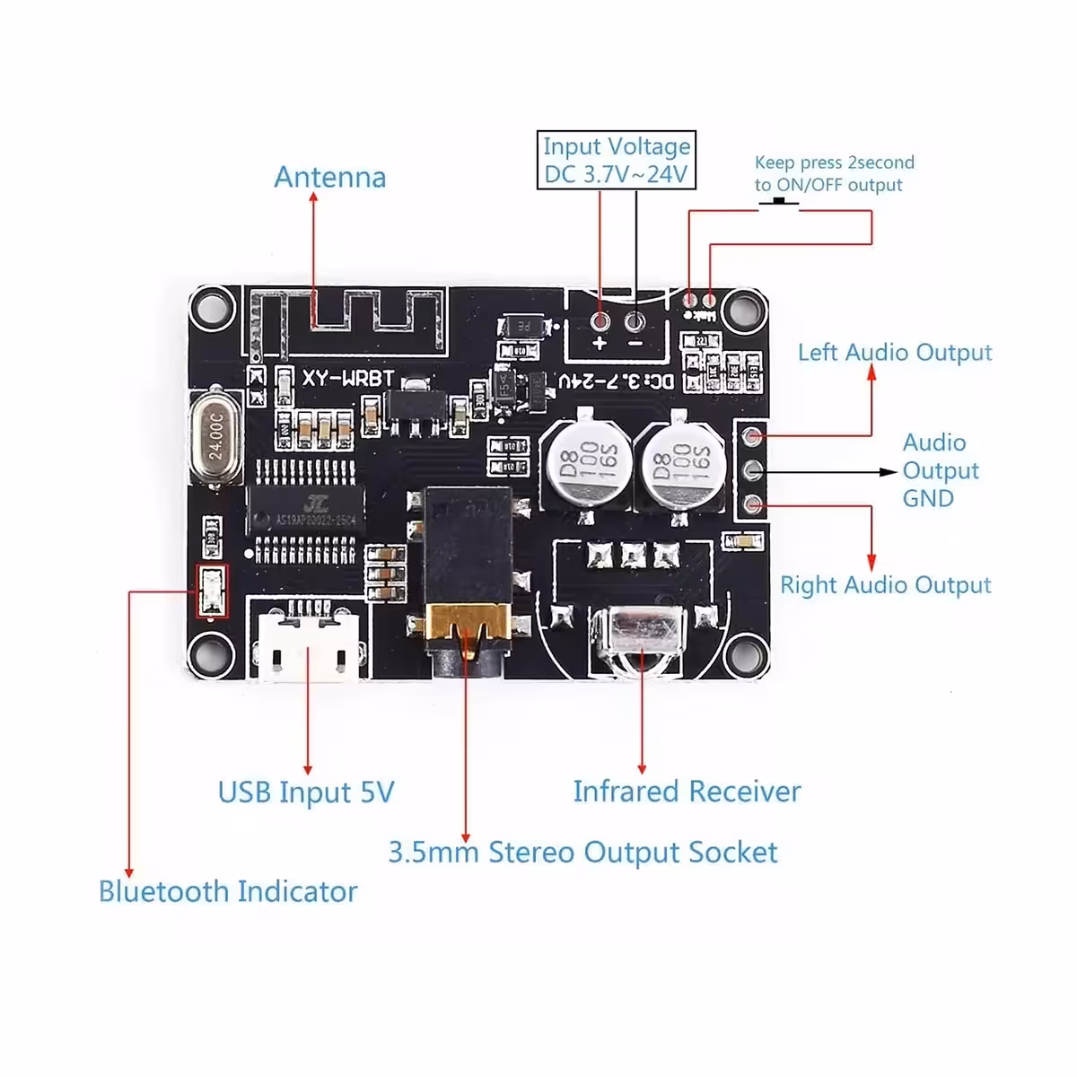 XY-WRBT je moderný Bluetooth audio dekodér modul vybavený priloženým diaľkovým ovládaním pre plnú kontrolu na diaľku. Ideálny na integráciu do DIY projektov, tento audio prijímač poskytuje stabilné pripojenie a vysokokvalitné stereo prehrávanie.