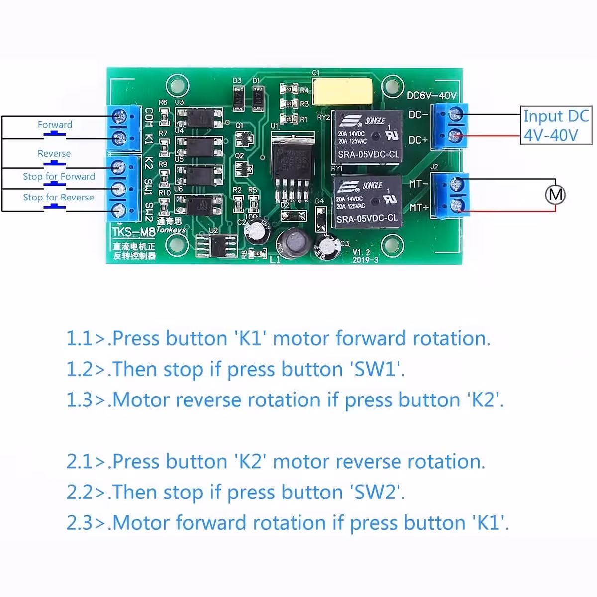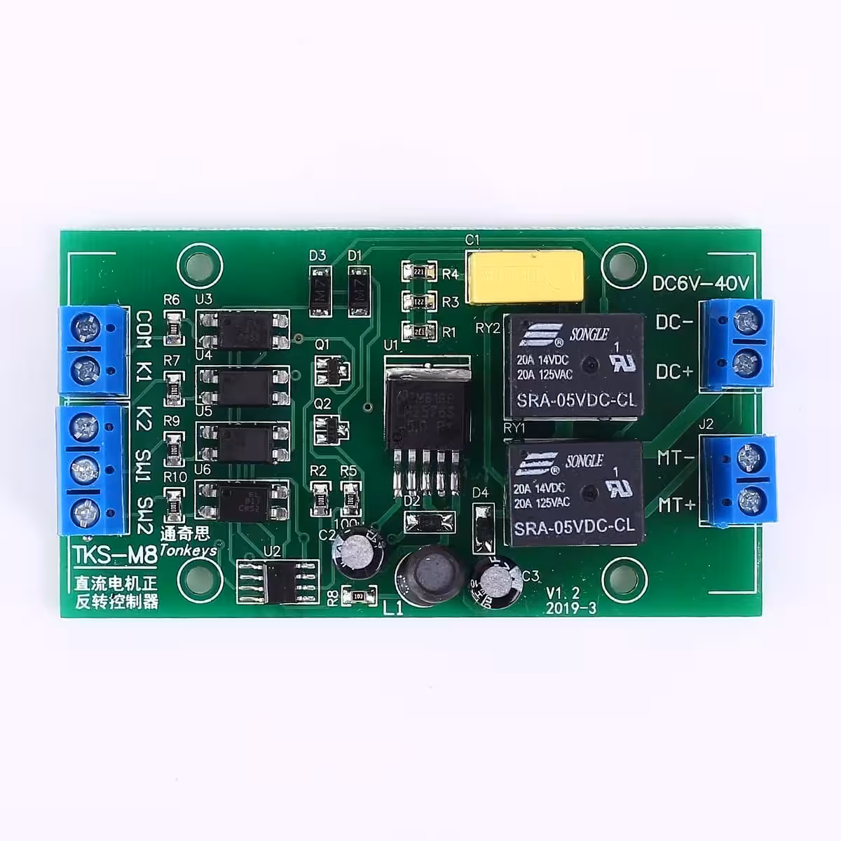 Kompaktný modul pre riadenie smeru DC motorov, ideálny pre systémy s koncovými spínačmi, pohony, lineárne mechanizmy alebo DIY projekty, kde je potrebné ovládanie dopredu a dozadu. Funguje v širokom rozsahu napätí od 4V do 40V, pre stabilnú prevádzku sa odporúča 6V–36V. Pripojený motor dostáva rovnaké napätie ako napájanie modulu.