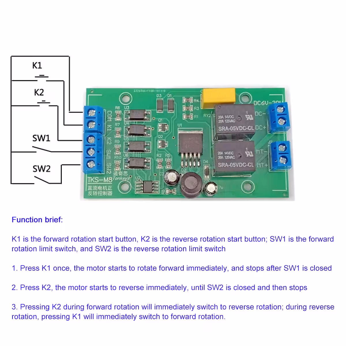 DC motorový regulátor smeru – DC 4–40V, až do 20A, režimy PO/P1 s koncovými spínačmi