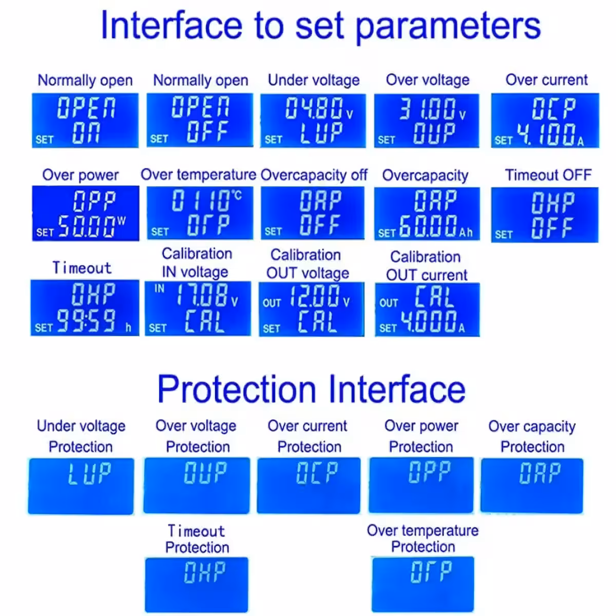 - Nastavenie ochranných parametrov a prahov: Dlhým stlačením U/I vstúpte do menu ochranných parametrov. Použite SW pre výber požadovanej ochrany: LUP (podnapätie), OUP (prepätie), OCP (preprúd), OPP (prepäťový výkon), OAP (nadmerná kapacita), OHP (oneskorenie), OTP (prehriatie). Nastavte prahy a aktivujte/deaktivujte ochrany podľa potreby.