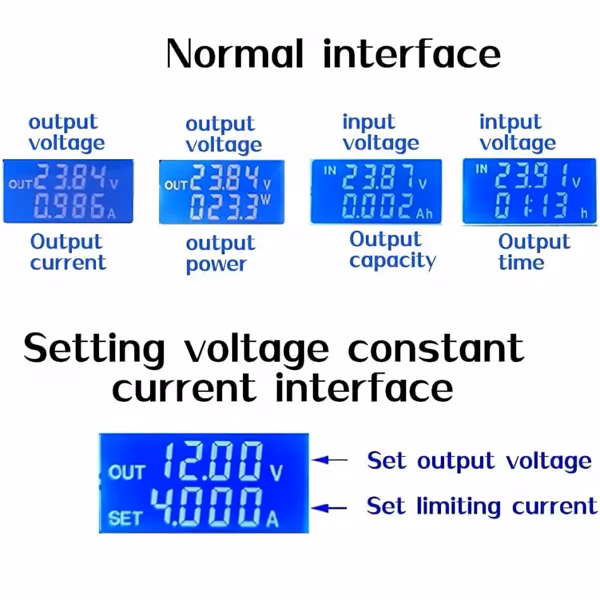 - Prepínanie parametrov zobrazenia: V normálnom režime stlačte tlačidlo SW pre prepínanie zobrazenia medzi napätím (V), prúdom (A), výkonom (W), kapacitou (Ah) a časom (h). Dlhé stlačenie tlačidla SW prepne zobrazenie medzi vstupným napätím (IN) a výstupným napätím (OUT).