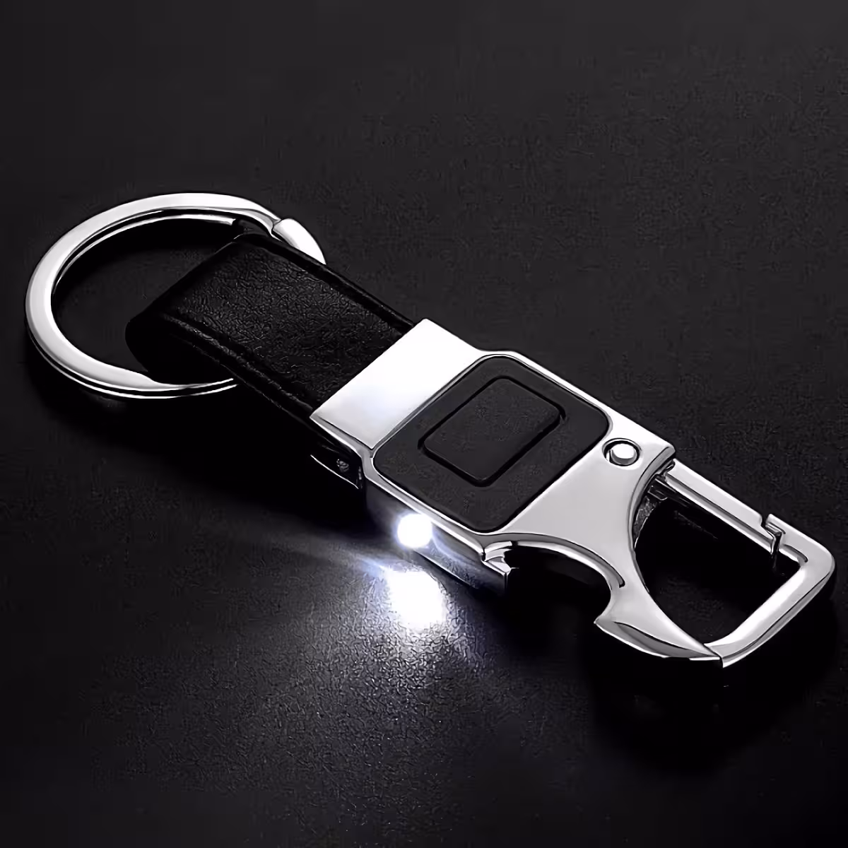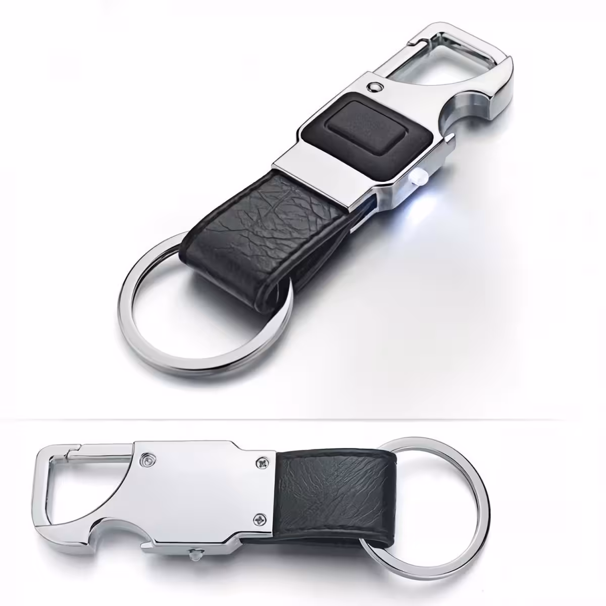 Luxusný kožený kľúčenka na auto s LED, otváračom na fľaše a svietidlom – dokonalý darček pre mužov