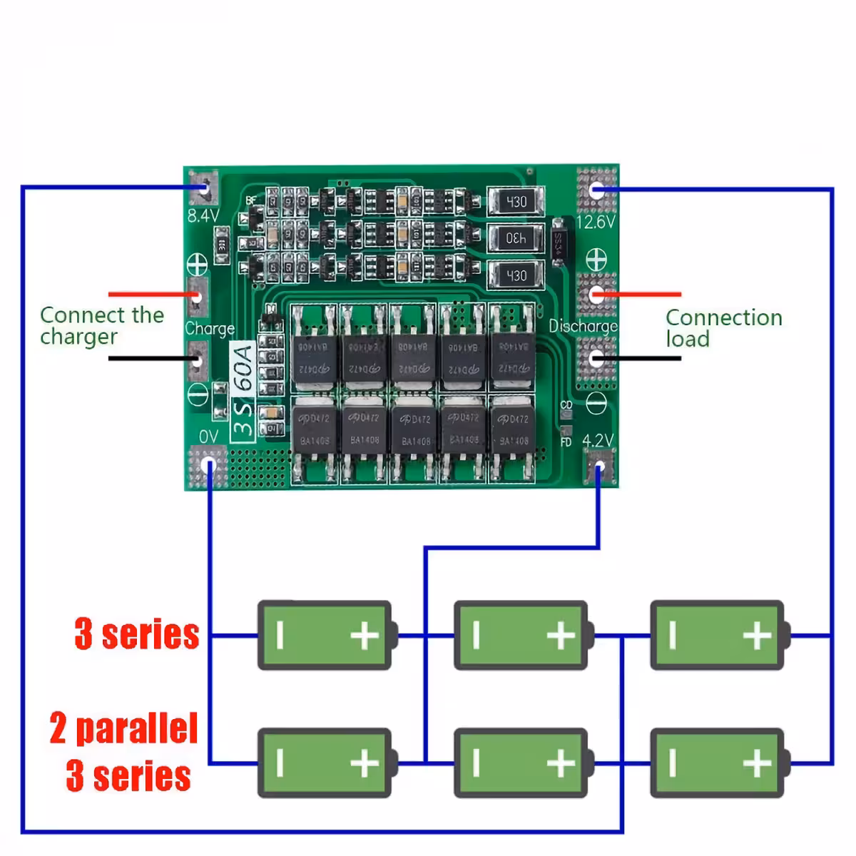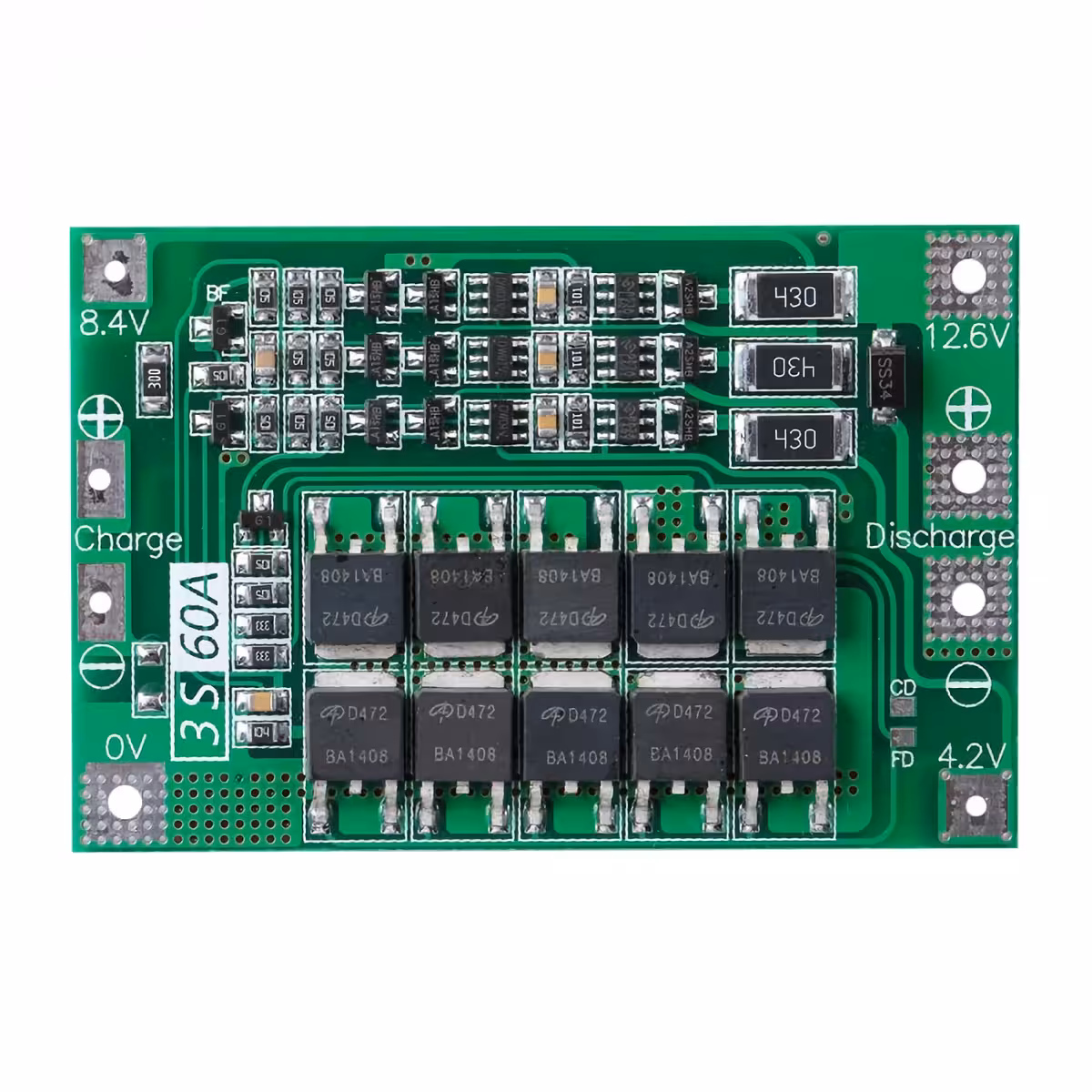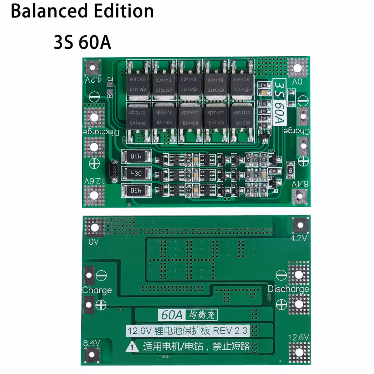BMS modul 3S 60A poskytuje kompletnú ochranu pre Li-Ion batérie 18650 14,8V (3S) a je ideálny pre aplikácie ako vŕtačky, elektrické skrutkovače, drony, RC autíčka, robotické vysávače a iné prenosné výkonné zariadenia.