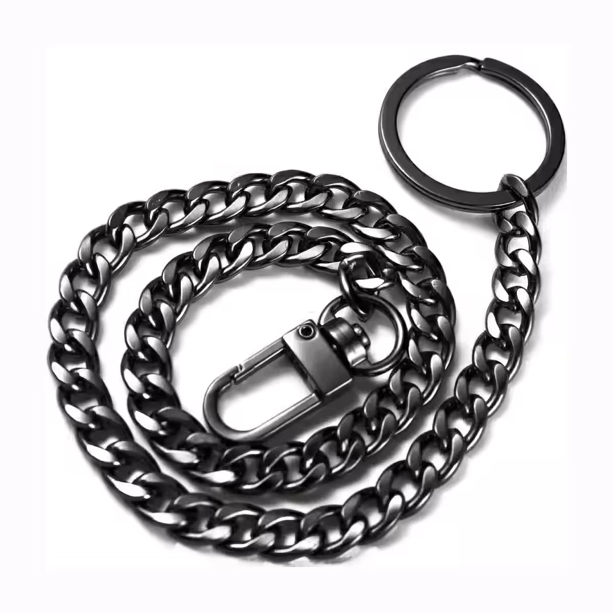 Vyrobený z odolnej nehrdzavejúcej ocele, reťaz má čierny chrómovaný povrch, pevnú konštrukciu a je vybavený zapínaním Snap-On na jednom konci a kľúčenkou na druhom. Dá sa ľahko pripevniť k džínsom, vojenským nohaviciam, rovno strihaným alebo s nízkym sedom.