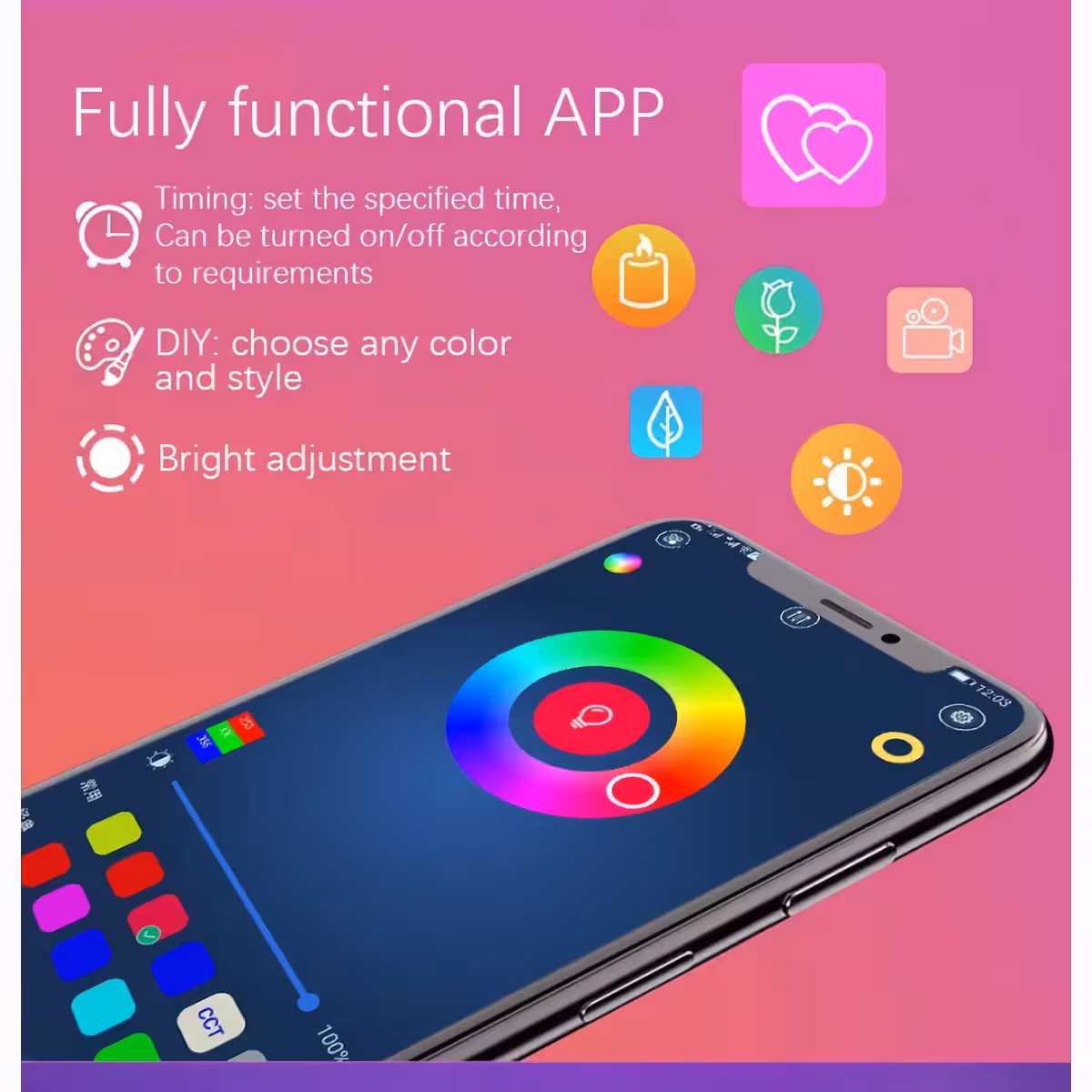 - Integrovaný hudobný senzor – svetlo reaguje na zvuk a hudbu