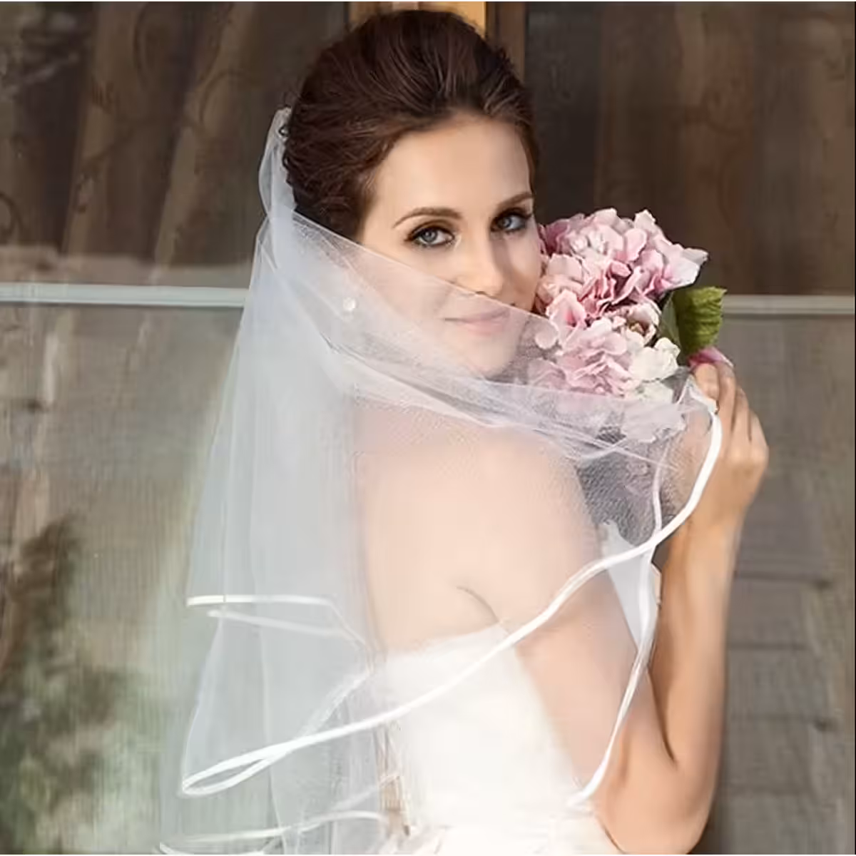 Ohromujúci svadobný závoj, ideálny pre svadby v roku 2025, vyrobený z jemného tylu vysokej kvality, s elegantným lemovaním na okraji. Tento biely závoj je navrhnutý špeciálne pre moderné nevesty, ktoré chcú mať štýlový a praktický doplnok.